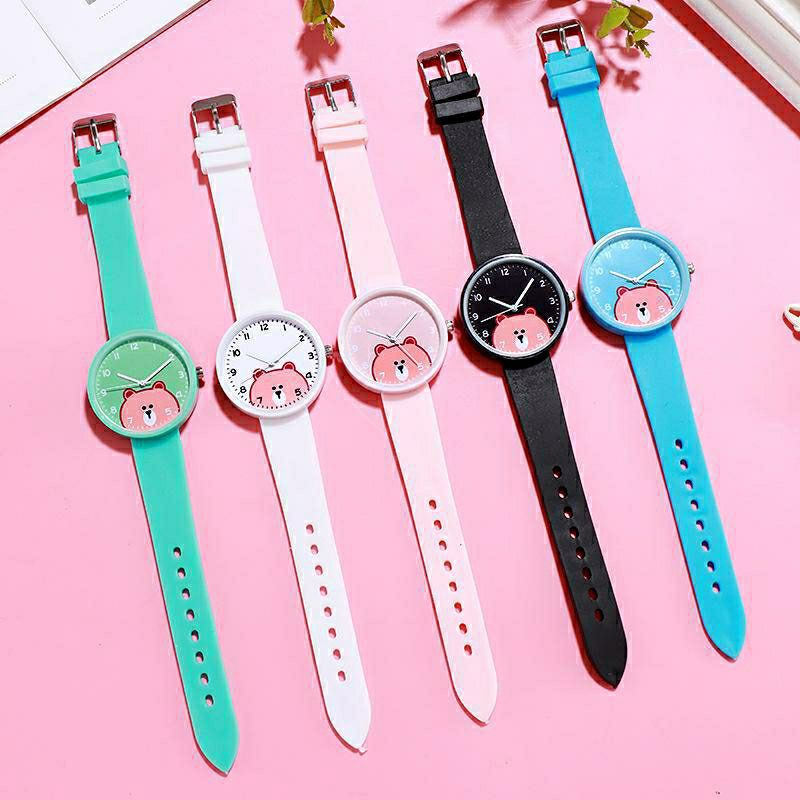 Harga jam tangan wanita model bulat gambar beruang brown arloji cewek jam tangan analog perempuan bahan karet