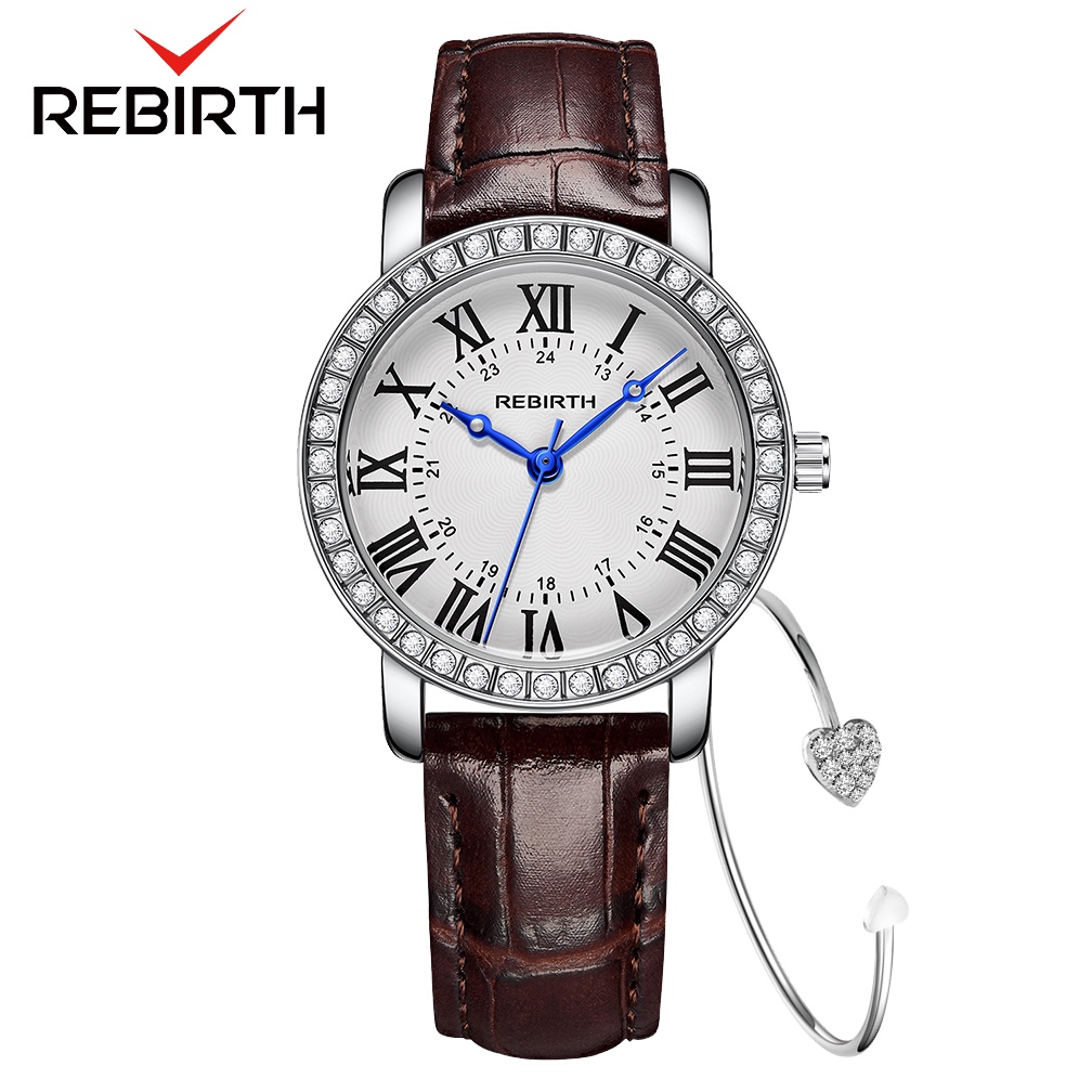 REBIRTH Jam Tangan Wanita Santai Olahraga Roman Dial Tali Kulit Tahan Air Kuarsa Jam Tangan Cewek